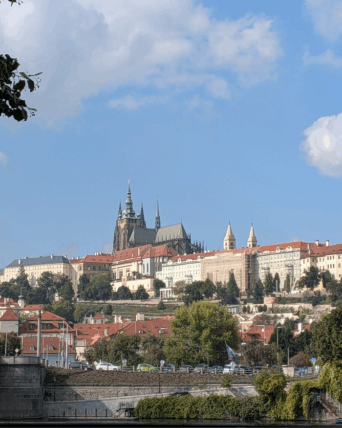Wir liefen dann weiter in Richtung Norden zum Fluss, dort war es etwas überschaubarer. Vollbesetzte Ausflugsdampfer schipperten gemächlich über die Moldau, wir folgten dem Fluss in Richtung Karlsbrücke und hatten einen wunderschönen Blick auf die Prager Burg auf der anderen Flussseite.